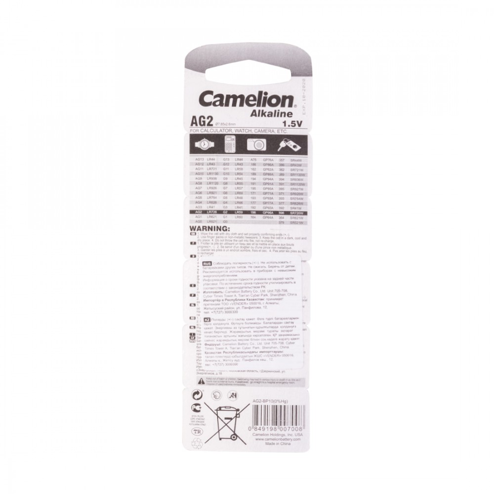 Батарейка CAMELION Alkaline AG2-BP10(0%Hg) 10 шт. в блистере