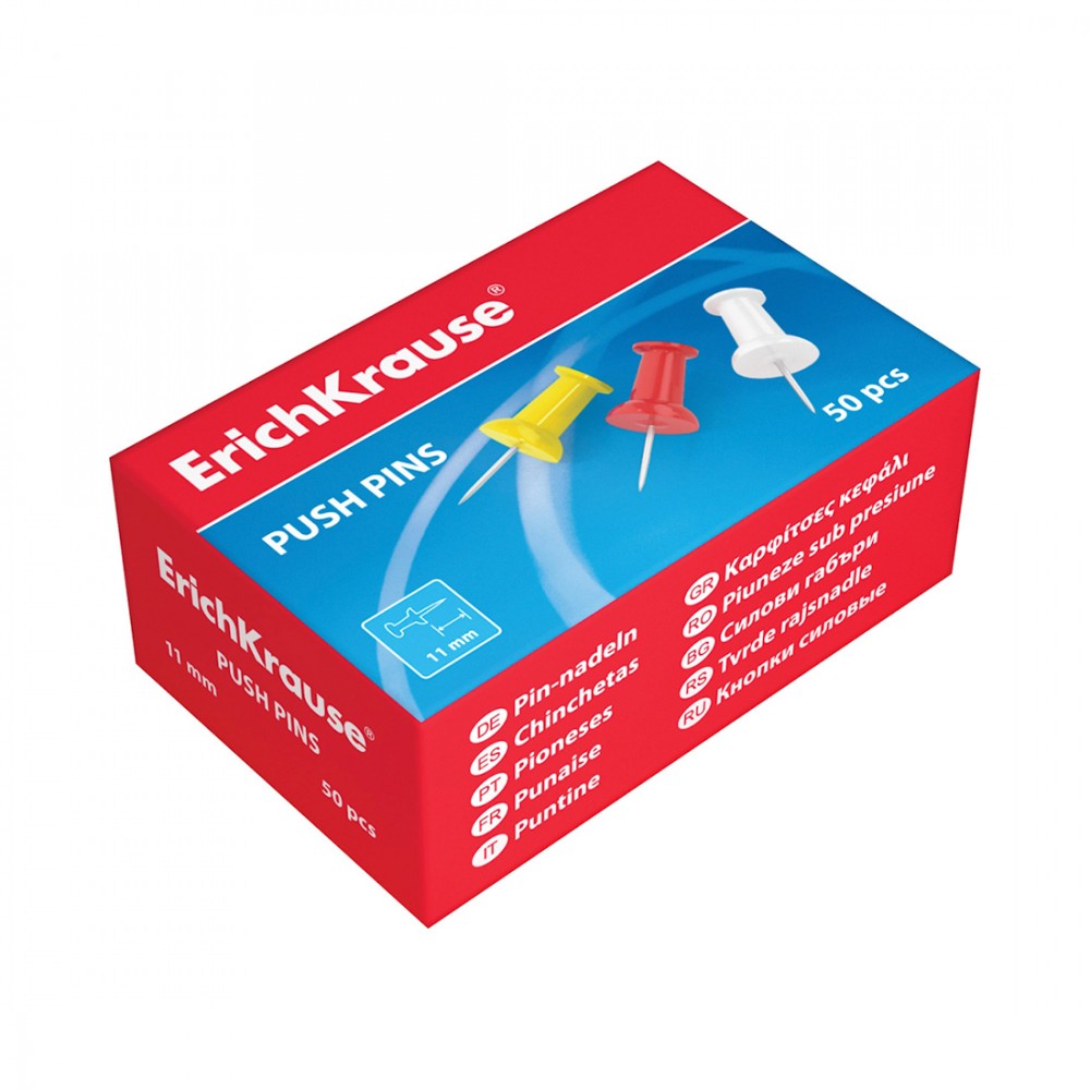 Используются для закрепления информационных листов к пробковым и текстильным доскам, а также другим поверхностям. Диаметр 10мм, длина острия 11мм. Упакованы по 50 штук в картонной коробочке.