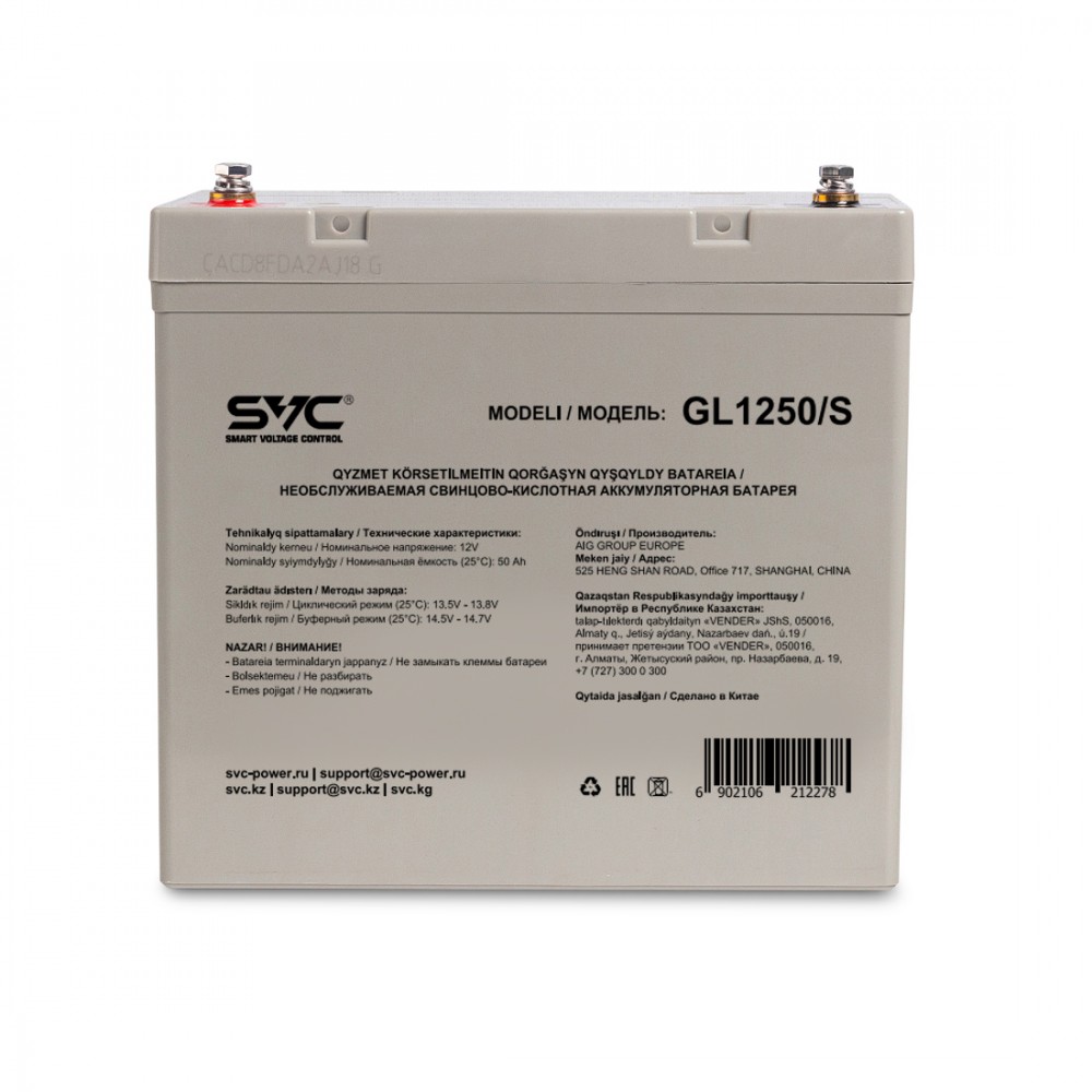 - Гелевая аккумуляторная батарея SVC GL1250/S 12В 50Ач Гелевые аккумуляторы SVC GL-серии сочетают в себе преимущества AGM и GEL аккумуляторов, позволяя получить высокие разрядные параметры от AGM-технологии и загущенный электролит от GEL-технологии, для стабильной работы при глубоких разрядах, с расширенным диапазоном рабочей тепрературы -15 ~ 60°C