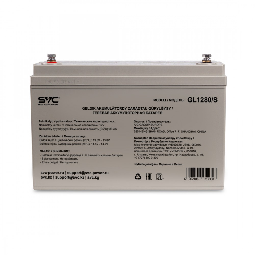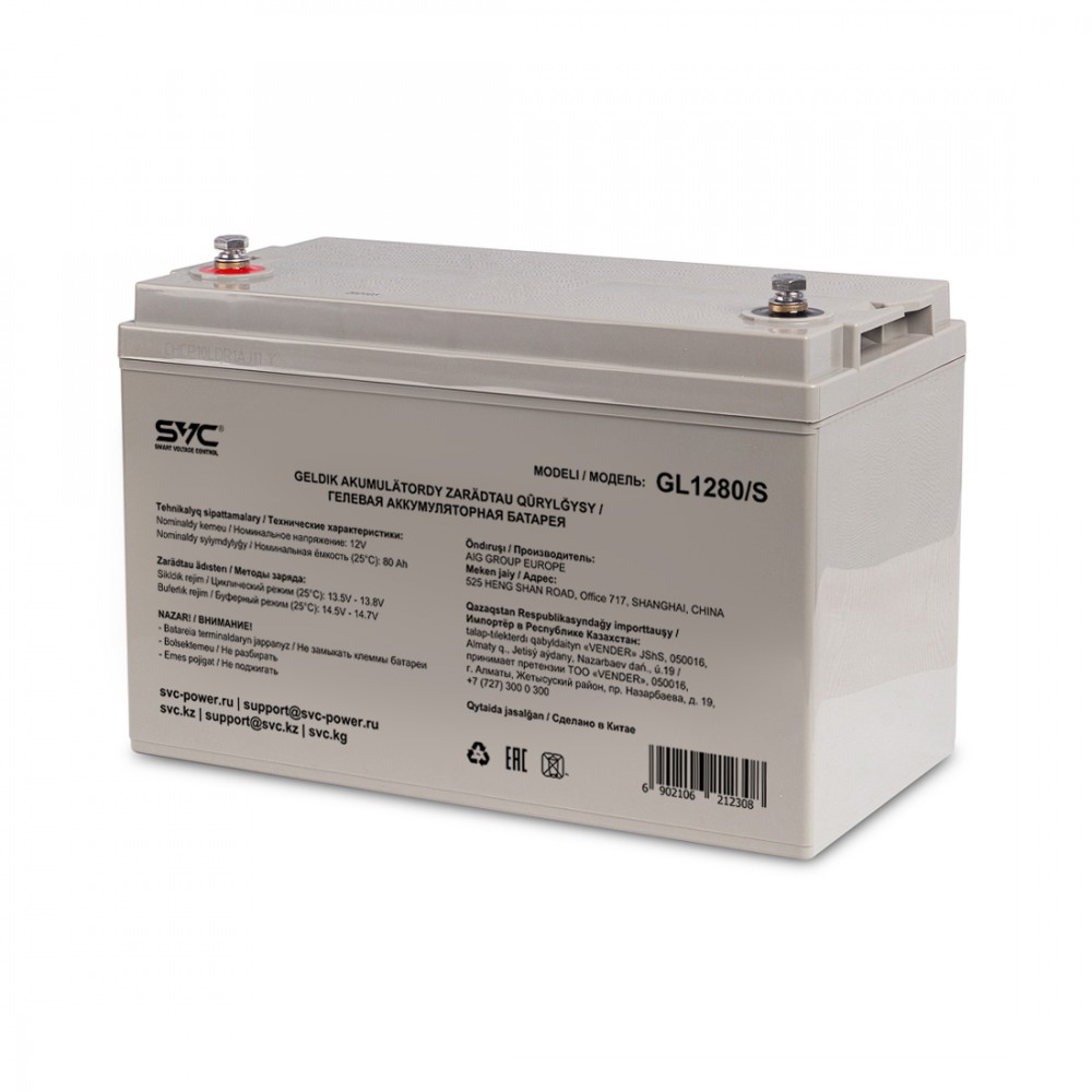 - Гелевая аккумуляторная батарея SVC GL1280/S 12В 80Ач Гелевые аккумуляторы SVC GL-серии сочетают в себе преимущества AGM и GEL аккумуляторов, позволяя получить высокие разрядные параметры от AGM-технологии и загущенный электролит от GEL-технологии, для стабильной работы при глубоких разрядах, с расширенным диапазоном рабочей тепрературы -15 ~ 60°C